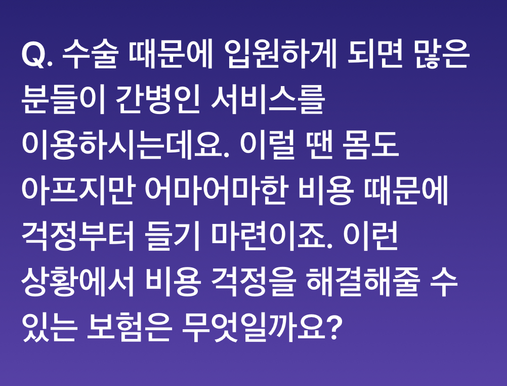 Q. 수술 때문에 입원하게 되면 많은 분들이 간병인 서비스를 이용하시는데요. 이럴 땐 몸도 아프지만 어마어마한 비용 때문에 걱정부터 들기 마련이죠. 이런 상황에서 비용 걱정을 해결해줄 수 있는 보험은 무엇일까요?