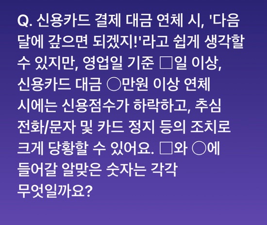 Q. 신용카드 결제 대금 연체 시, '다음 달에 갚으면 되겠지!'라고 쉽게 생각할 수 있지만, 영업일 기준 □일 이상, 신용카드 대금 ○만원 이상 연체 시에는 신용점수가 하락하고, 추심 전화/문자 및 카드 정지 등의 조치로 크게 당황할 수 있어요. □와 ○에 들어갈 알맞은 숫자는 각각 무엇일까요?