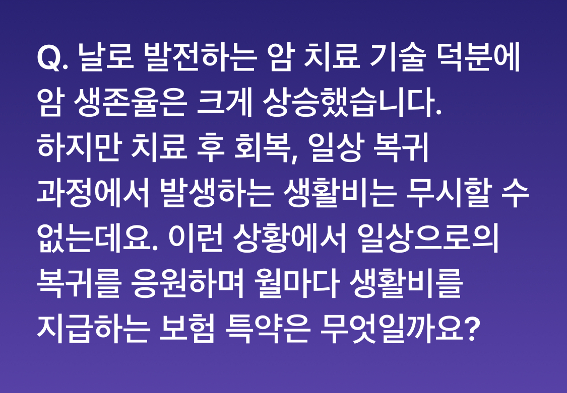 Q. 날로 발전하는 암 치료 기술 덕분에 암 생존율은 크게 상승했습니다. 하지만 치료 후 회복, 일상 복귀 과정에서 발생하는 생활비는 무시할 수 없는데요. 이런 상황에서 일상으로의 복귀를 응원하며 월마다 생활비를 지급하는 보험 특약은 무엇일까요?