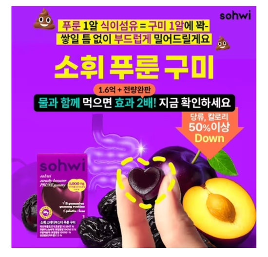 쫀득한 구미 1알에 푸룬 식이섬유는 그대로! 당류와 칼로리는 절반 이하로 낮춰↓ 푸룬 그동안 못먹던 이유, 이 한알로 해결해 드려요 ⚠망설이면 품절