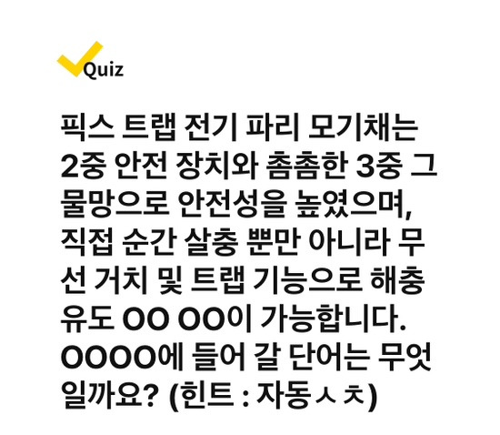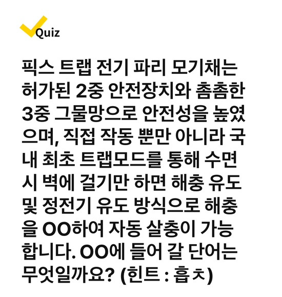 픽스트랩 전기 파리 모기채는 허가된 2중 안전장치와 촘촘한 3중 그물망으로 안전성을 높였 으며, 직접 작동 뿐만 아니라 국 내 최초 트랩모드를 통해 수면 시 벽에 걸기만 하면 해충 유도 및 정전기 유도 방식으로 해충 을 ᄋᄋ하여 자동 살충이 가능 합니다. OO에 들어 갈 단어는 무엇일까요? (힌트 : 흡ᄎ)